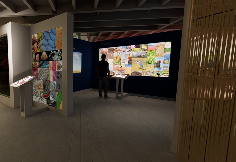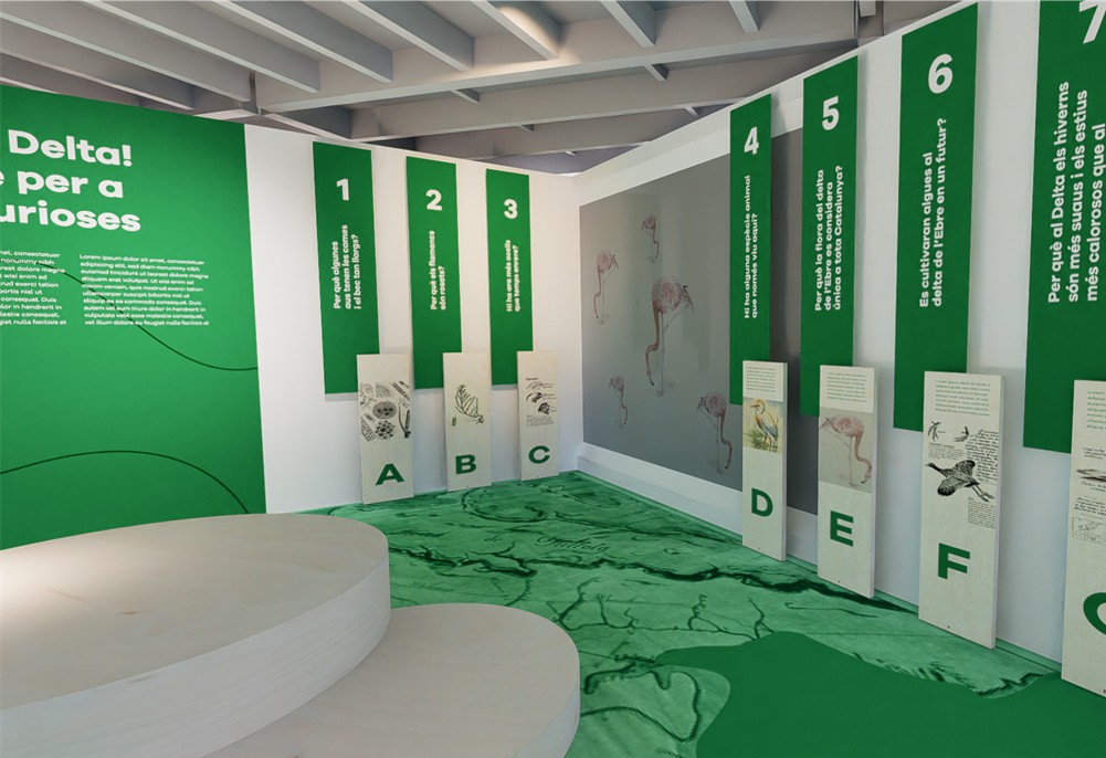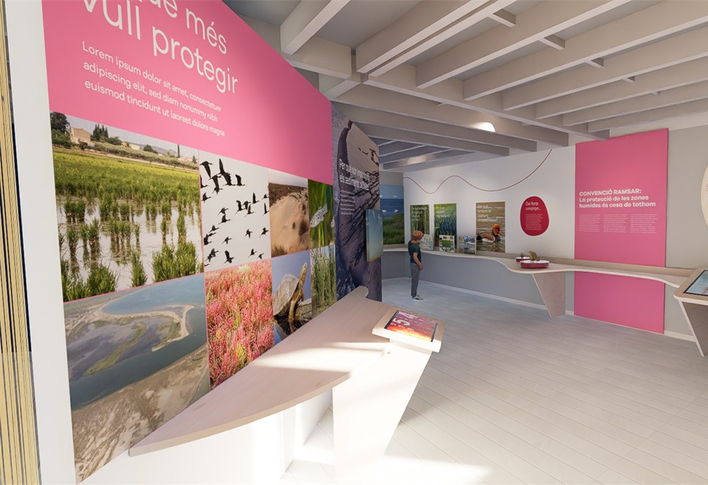 Propuesta de reforma e intervenciones de comunicación en el interior y el exterior de la actual Casa de Fusta en el Delta del Ebro. Se presenta una distribución diferenciada en ámbitos conceptuales que facilitan la transición del público por los diferentes contenidos.